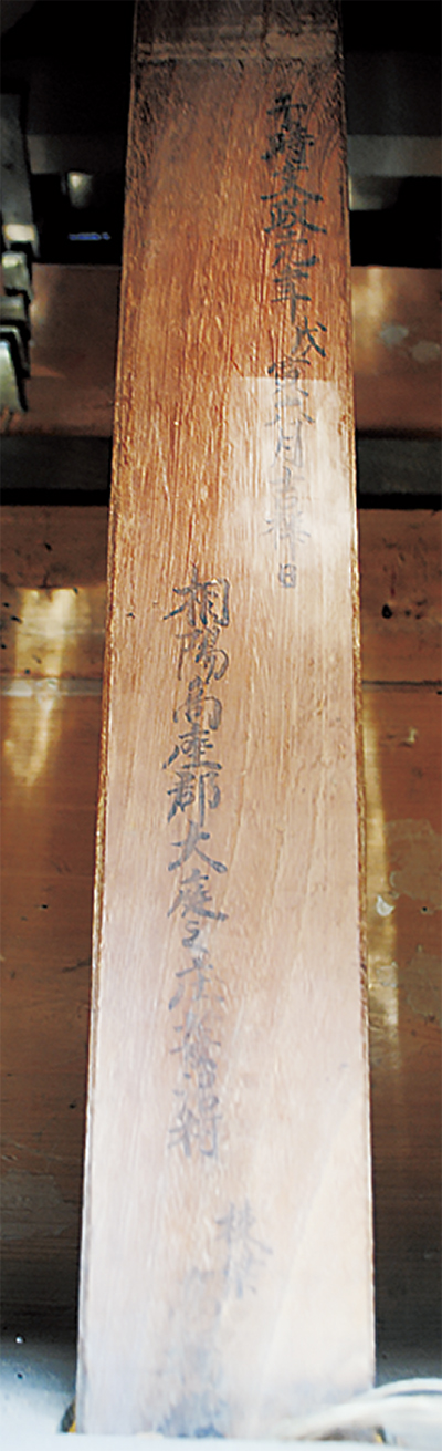 土井氏は4日、固唾を飲んで見守る同会や神社役員の前で、神輿の中に頭をもぐりこませて文字を確認。「干時文政元年戊寅六月吉祥日 相陽高座郡大庭之庄菱沼村 棟梁高橋儀右衛門」と書かれていることが分かった。江戸期に定着していた御家流の書体であることから、当時の筆跡であるのはほぼ間違いないという。