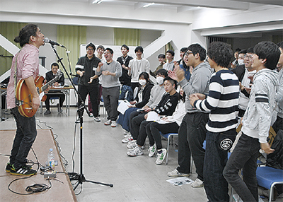 全国の福祉施設や学校などでコンサートを行っているリトルキヨシさんが同校で歌うのは昨年に続いて2回目。当日は112人の学生を前に自身の持ち歌やカバー曲を披露した。「今日という日は一度だけ」と熱のこもった言葉を贈られた学生たちは立ち上がりながら盛り上がっていた。