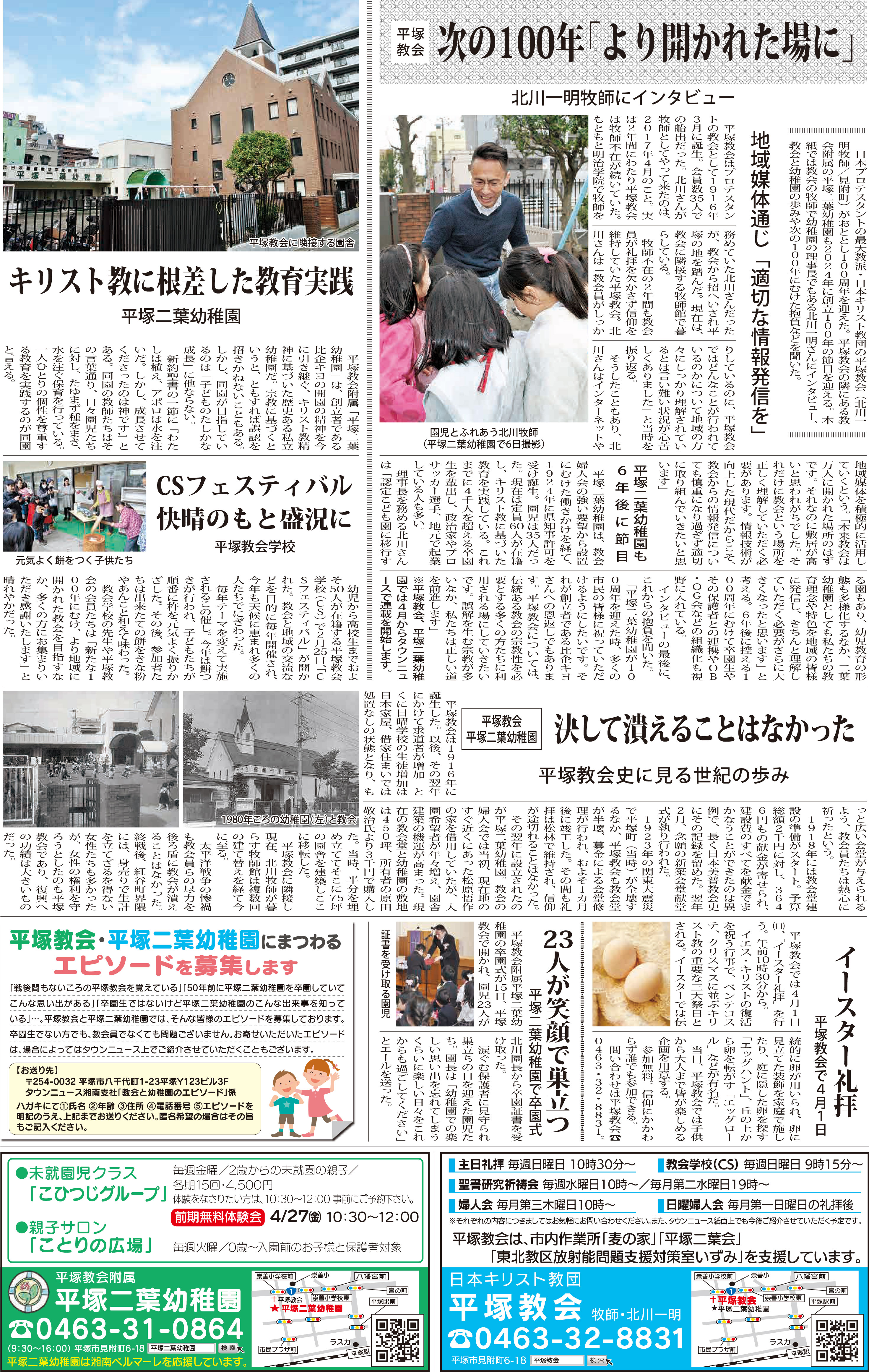 ※平塚教会、平塚二葉幼稚園では4月からタウンニュースで連載を開始します。