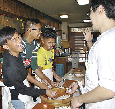 湘南ベルマーレが、先月23日から26日にかけてフィリピンサッカーリーグ所属のJP Voltes FCの育成組織から選手を招いて交流事業を行った。来日したのはガブリエルくん(13)ら3人。滞在中は日本のサッカーを学び、24日には日本料理店「真鶴」(紅谷町)で握り寿司に挑戦。参加者は「出来栄えは90点」と笑顔を見せていた。