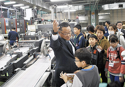 見学会当日、参加者らは同社担当者から会社の歴史や事業内容についての説明を受けた後、稼働中の工場内へ。ロール状の印刷紙やインクの保管庫、印刷された紙を高速で運ぶベルトコンベアー、印刷物が裁断される様子などを間近で見た参加者たちはみな目を丸くして驚いた表情をみせていた。見学には同社の杉山社長も同行、参加した子供たちに分かりやすく説明したり、質問にも笑顔で答えていた。