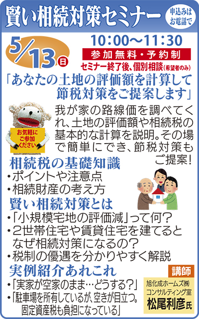 「あなたの土地の評価額がその場で簡単に計算できます」「基本的な相続税の考え方や節税方法をお教えします」。旭化成ホームズでは、賢い相続対策セミナーを開催する。