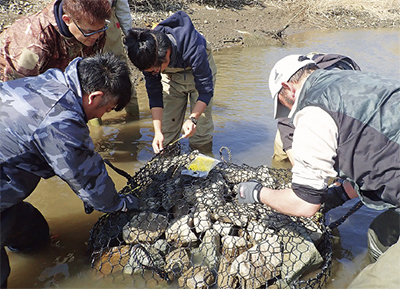 同法人では5年ほど前から河川の生物調査のために常緑樹の枝の束を沈め、そこに棲みついたウナギやカワエビを獲る柴漬け漁の仕組みを利用した棲み処をつくり、生き物の観察に取り組んできた。しかし枝は朽ちやすく長期の観察ができないため、高耐久性樹脂網を使用した、(株)フタバコーケン(静岡県)開発の石倉カゴに目を付けた。まずは河口付近の生息状況を調べ、保護につなげたい考えだ。