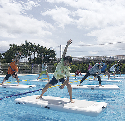 水上に浮かべたボードの上で行う「SUP(スタンドアップパドルボード)ヨガ」の無料体験会が、5月3日(木)に大磯町の屋外プール施設「ポートハウスてるがさき」で催される。要予約。