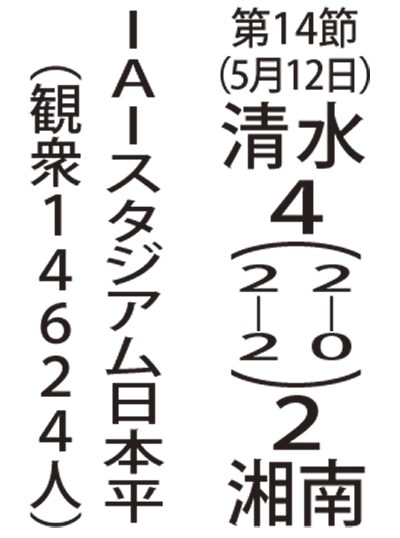 70分に清水の松原后が2枚目の警告で退場し、湘南は数的優位に立つ。終了直前の95分には、右クロスに走り込んだ野田隆之介が倒れ込みながらも合わせ、監督の起用に応える得点をみせた。その後も追いすがったが届かず、J1リーグ3戦連敗となった。