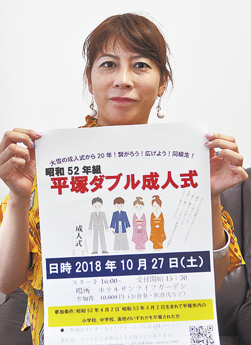 フリーアナウンサーで発起人の竹本有希さんは、数年前に開かれた「三十路式」の司会を務め、旧交を温める様子を羨ましく感じた。ダブル成人式の催しが近隣市で開かれていることも知り、今も親交のある金旭中や山城中の同級生と開催を決めた。「平塚の同級生というキーワードで、人間関係の輪を広げて欲しい」と話す。