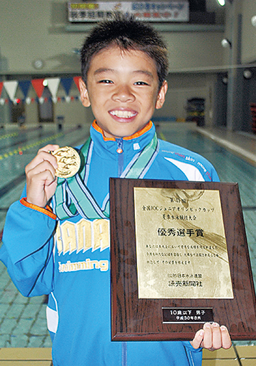 齋藤君は同大会で平泳ぎ50mでも4位入賞。その最も得意な泳法を武器に、個人メドレーで金メダルを獲得した。「1位を目指していたから嬉しい。優秀賞は驚いた」とにっこり。