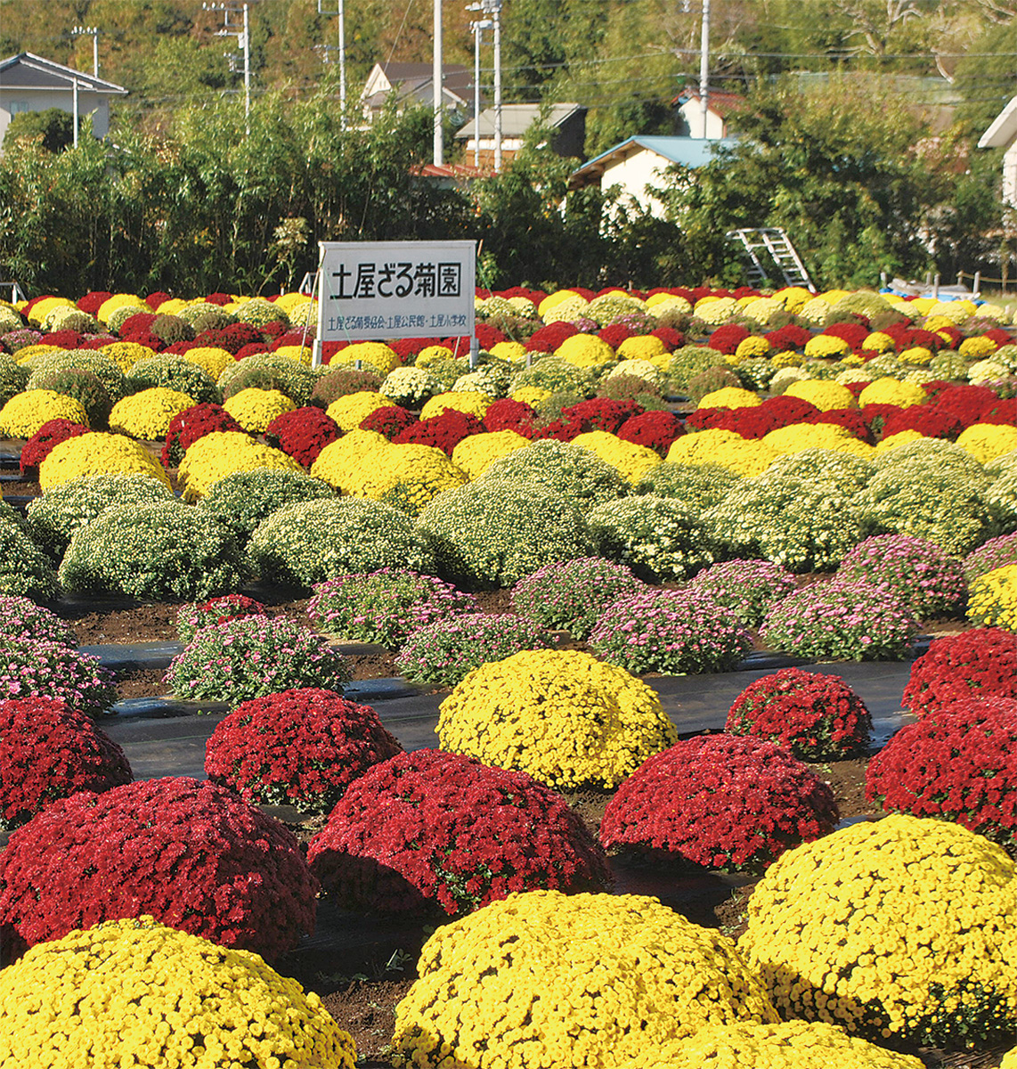 同園は土屋菊づくり愛好会と土屋小学校児童が協力して4年前から整備。赤、白、黄色のざる菊が通行人の目を和ませている。土屋公民館では4日まで「つちや菊花展」を開催。児童や愛好家が育てた菊が展示されている。同会の会員は「これから白の花が咲くので、多くの人に楽しんでもらいたい」と話していた。見ごろは11月中旬まで。