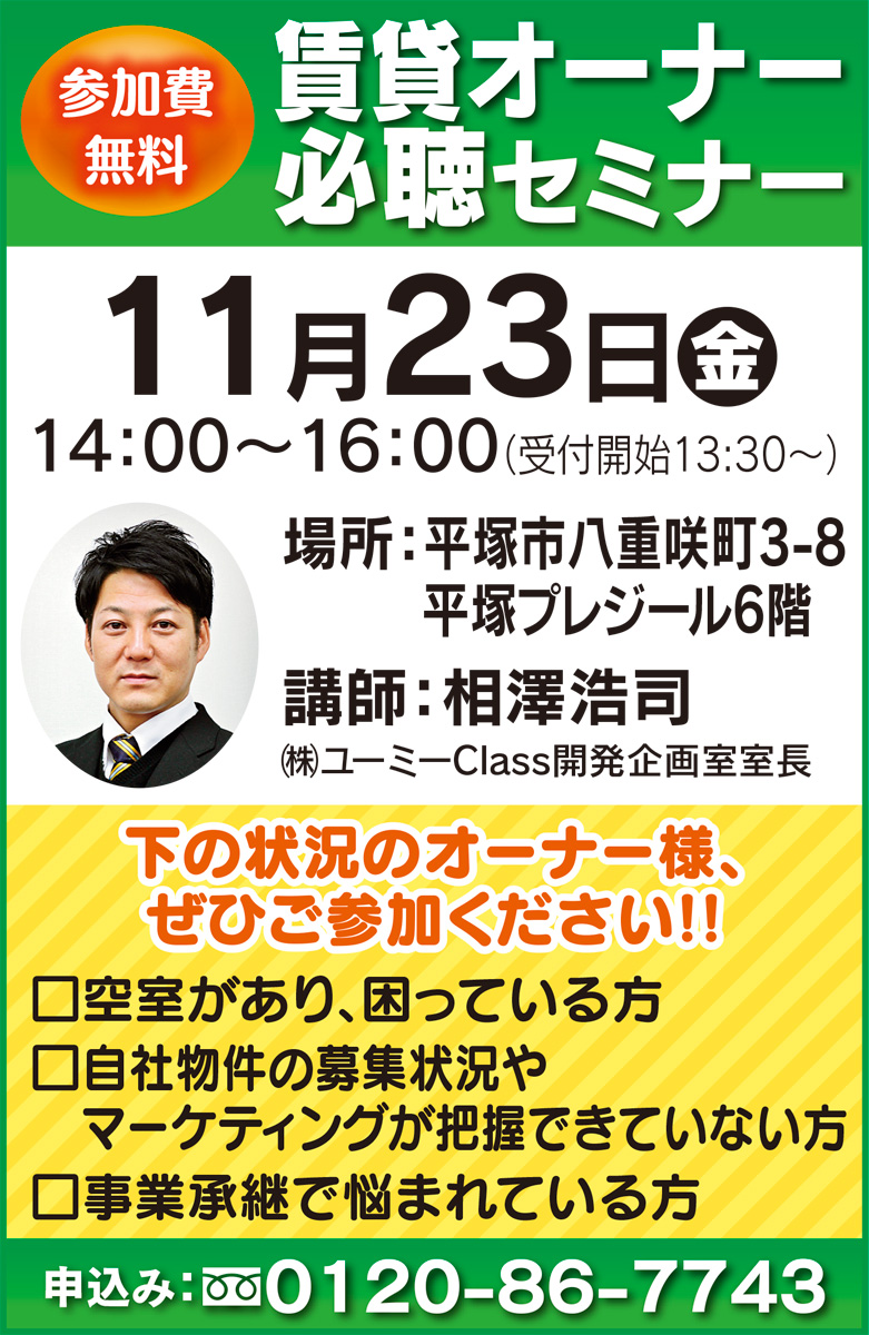 当日行われる開所記念セミナーでは、年間1000世帯の新規管理受託や空室の稼働率改善を図るなど、賃貸物件の経営改善士として実績をもつ「(株)ユーミーClass」の開発企画室室長・相澤浩司氏が、繁忙期を前に、最新の賃貸市場から入居者ニーズ、空室対策方法などを講話する。