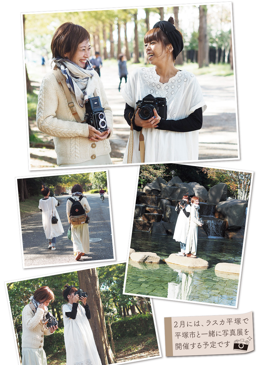 浅間町在住の君島裕美さん(左)と岡崎在住の冨木沙織さん(右)は、フィルムカメラで撮影した平塚の日常をインスタグラムで発信している。平塚市がシティプロモーションの一環として始めた「♯hiratsukagoodフォトキャンペーン」をきっかけに知り合った二人は、昨年5月に市内のカフェで個展を開くなど、活動の幅を広げている。「一緒に撮影に出かけたり、お互いの作品について話したりできる友達ができてうれしい」と二人は顔を見合わせて笑う。