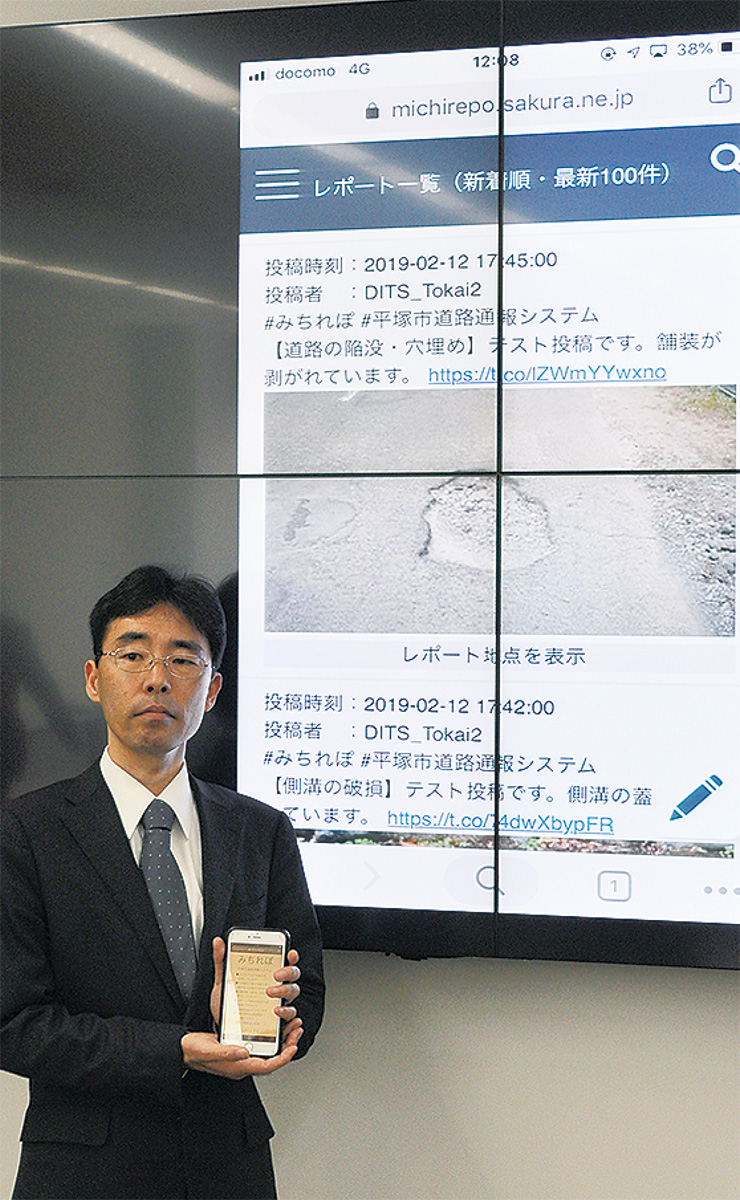 平塚市は東海大学と連携し、スマートフォンから道路の破損状況を通報するシステム「みちれぽ」を開発し、3月1日から運用開始する。開発者で東海大情報理工学部の内田理教授と落合克宏市長が13日、記者発表した。