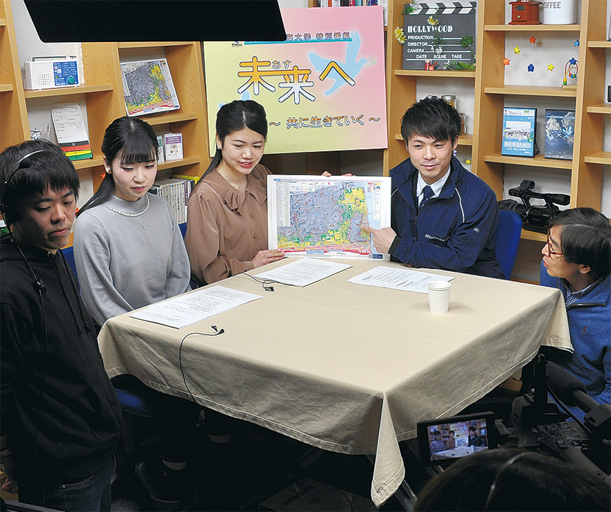 東海大学文化社会学部広報メディア学科の学生プロジェクト「テレビ班」が防災・減災をテーマにした特別番組「未来(あす)へ〜共に生きていく〜」を制作した。3月11日(月)午後1時〜3時、湘南ケーブルネットワークをキー局とした県内8ケーブルテレビ局で同時放送。番組の企画や取材、撮影、編集などすべて学生が担い、防災・減災情報満載の2時間番組となっている。