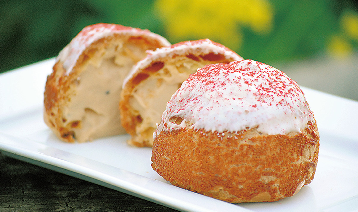 地元農家との共催による恒例イベントで、湘南ゴールドの果肉をたっぷり使ったタルトの販売、手作り屋台、同店のランチ券や地場産野菜が当たる大抽選会など盛りだくさん。なかでも、鎧塚俊彦シェフ本人が腕を振るう「1日限定スイーツ」は、行列必至の人気企画だ。今年の商品は見た目もかわいらしい桜シュークリーム=写真。1個300円。限定500個。