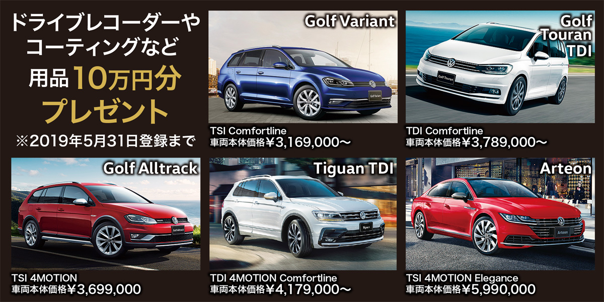 さらに、他のゴルフシリーズやティグアン、アルテオンには用品10万円がプレゼントに。詳しくはショールームへ。