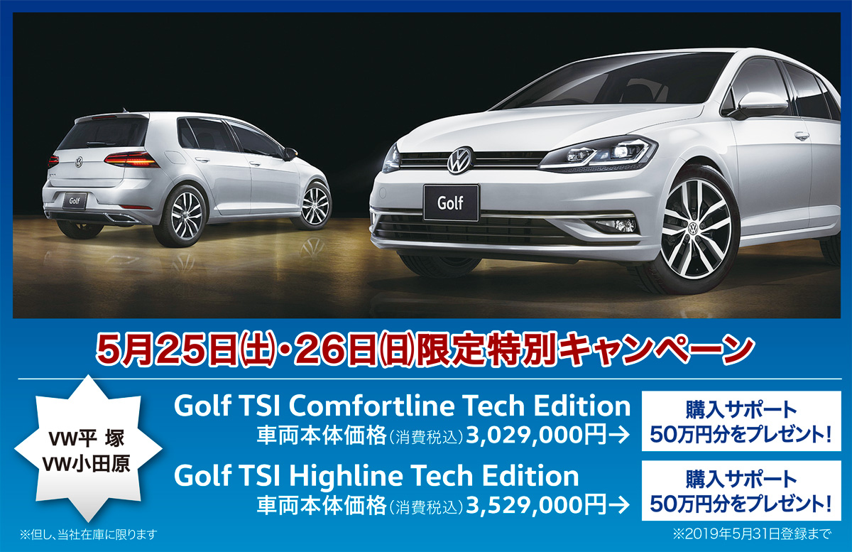 VW平塚/小田原の令和記念セール最後を飾るのは、このゴルフ テックエディション。5月25日(土)、26日(日)の2日間限定で、購入サポート50万円分をプレゼント。コンフォートラインなら、ポロとほぼ同じ価格に。ハイラインも通常のコンフォートラインの価格で手に入るなど、まさに「大盤振舞」といえる。