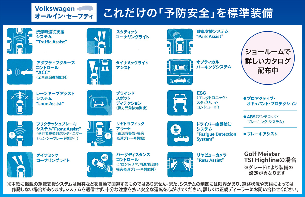 「輸入車は高額な上に、さらにオプションで高くなるのでは」と思われがちだが、ゴルフ マイスターはハイラインで18の「予防安全」が標準装備。車両本体価格359万9000円を叶えている。