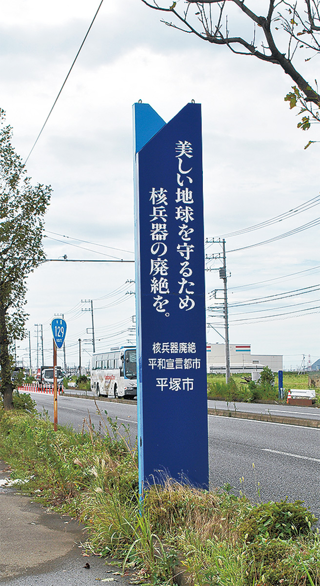 撤去対象の宣言塔は、「新吉際入口」信号付近にあり、1990年度に設置。高さ3・8m、幅0・6mで、看板2面に「美しい地球を守るため核兵器の廃絶を」「核兵器廃絶平和宣言都市 平塚市」と記載されている。