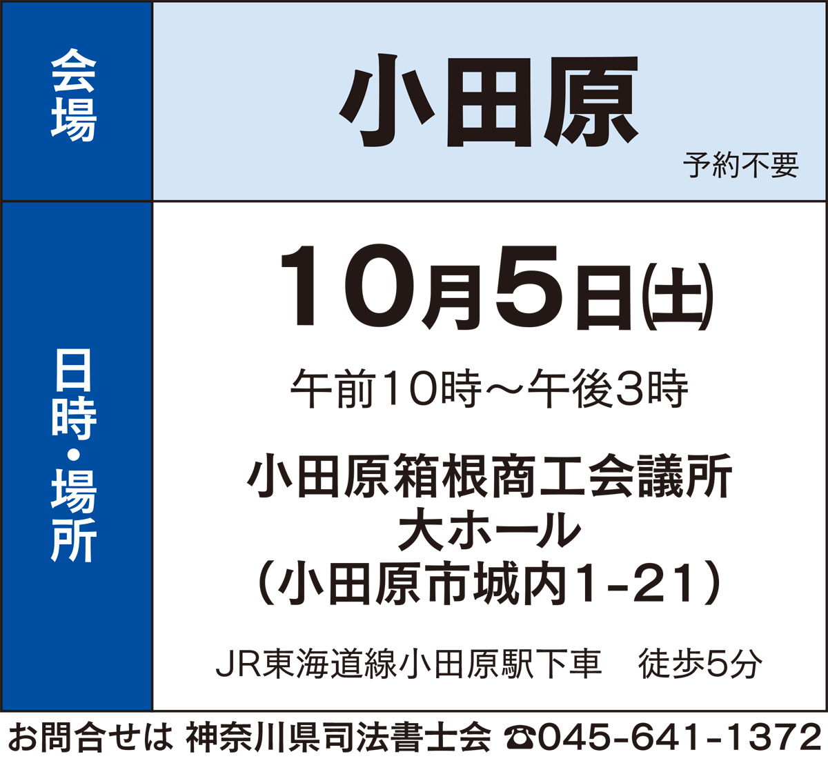 県内の司法書士と司法書士法人が所属する「神奈川県司法書士会」(紙谷繁昭会長)は10月1日の法の日を記念して各地で「無料法律相談会」を開催。司法書士が相続や遺言、成年後見、労働トラブル、借金、会社や土地・家屋の問題など業務範囲内の様々な悩みに応じる。詳細は県司法書士会へ。