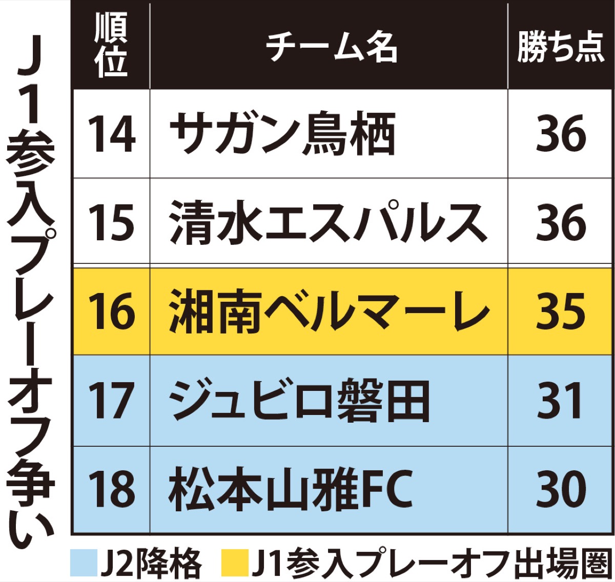 この結果、ベルマーレの勝ち点は35となり、17位とのリードを4に広げて16位以上が確定、ジュビロ磐田と松本山雅FCの自動降格が決定した。