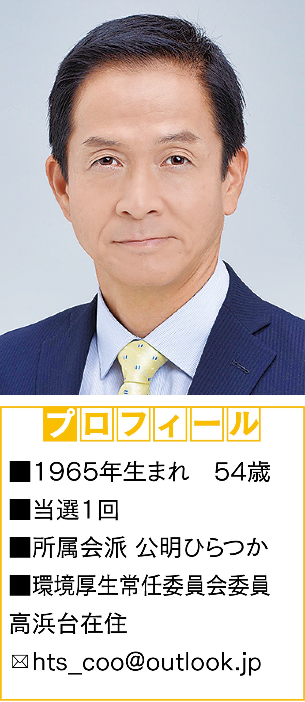 昨年の統一地方選挙で皆様の信任を頂き、新たに議員一期生として活動する場を頂戴いたしました。この半年、まずは皆様の中に分け入り「現場の声」を大切にして参りました。平塚市は海岸エリアの魅力アップチャレンジをはじめ、見附台再開発、ツインシティ事業など、新しい時代令和の幕開けと共に変革の槌音を高らかに生まれ変わろうとしています。