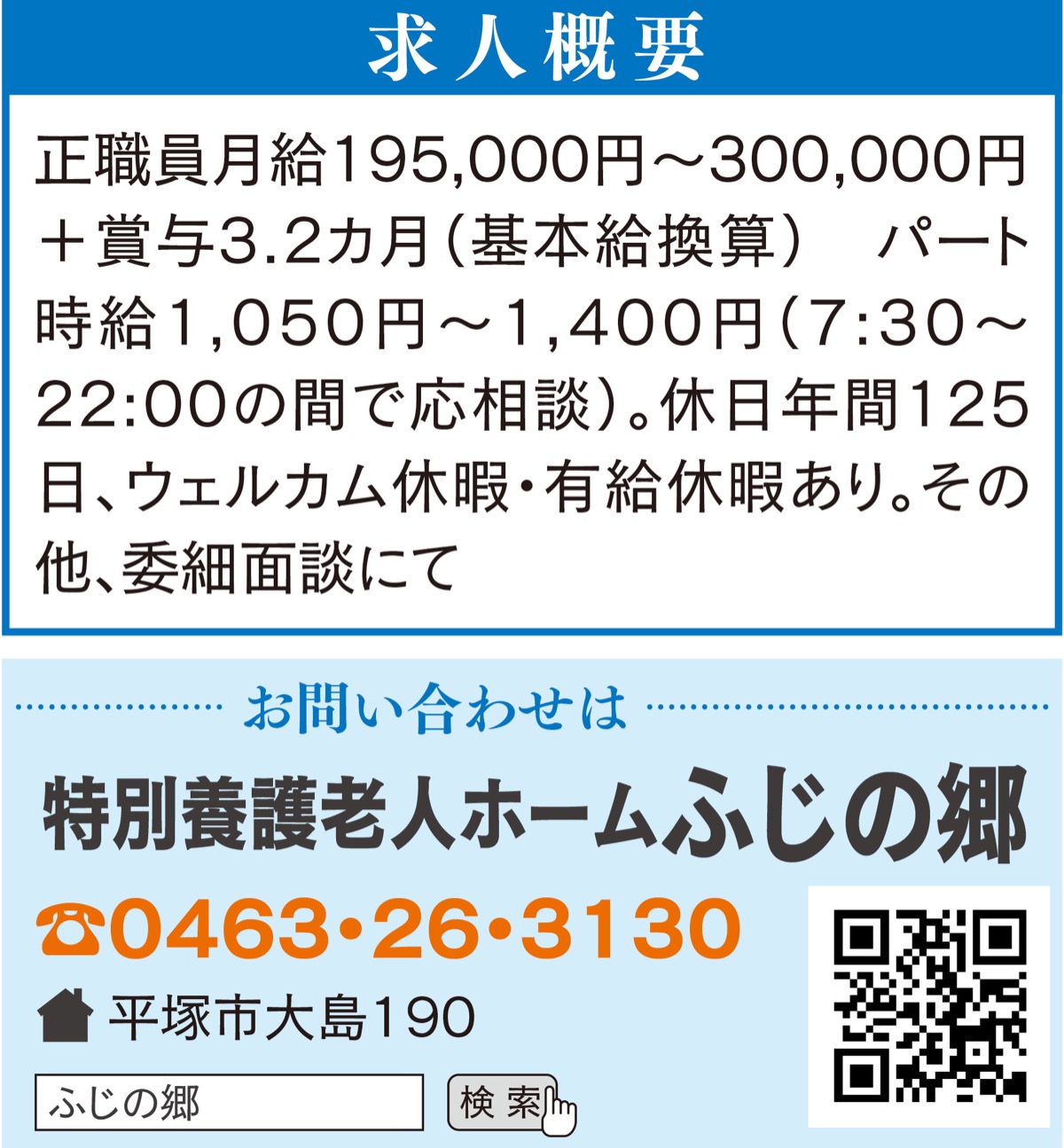 平塚市大島の特別養護老人ホーム「ふじの郷」では、介護職員を募集中。来年3月、藤沢市に新施設をオープンすることを見据えた求人で、勤務地はふじの郷となるが、来年以降は希望に応じて平塚・藤沢いずれも選択できるという。