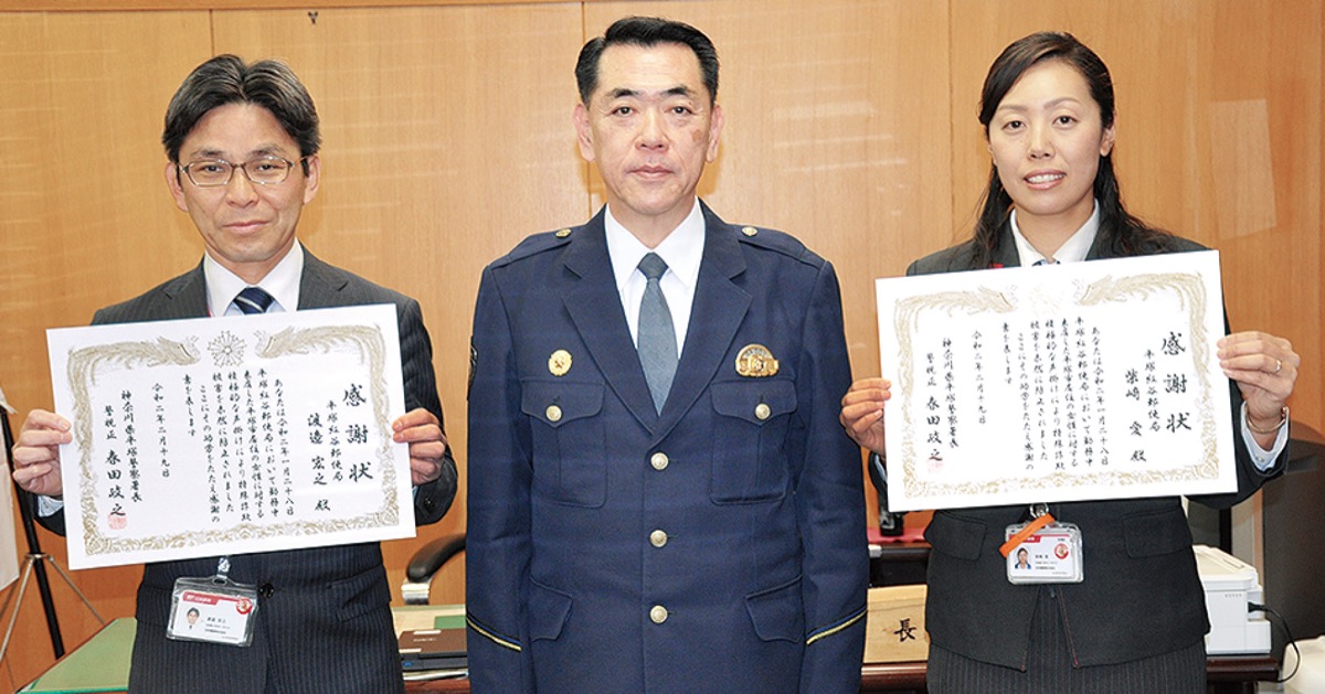 特殊詐欺を防いだとして平塚警察署(春田政之署長)は19日、平塚紅谷郵便局長の渡邉宏之さん(50)と同局窓口担当の柴崎愛さん(37)に感謝状を贈呈した。