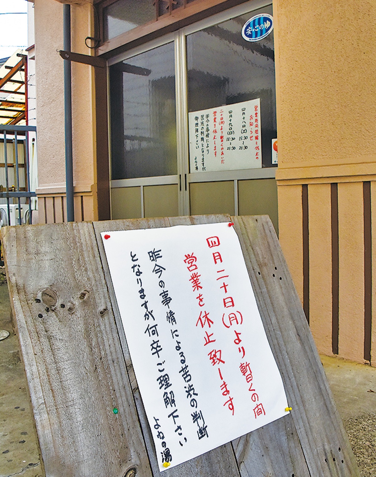 緊急事態宣言の対象外になっている立野町の銭湯「よねの湯」は、19日まで通常営業を続けていたが、福祉施設の休館にともない利用者が増えるなど対応が難しくなり、休業を決めた。同様に平塚の「富士の湯」はこれまで月、木曜日の2営業体制をとっていたが、23日は急遽休業したほか、5月6日に閉館する施設があるなど、各施設ともに不透明な状況が続く。