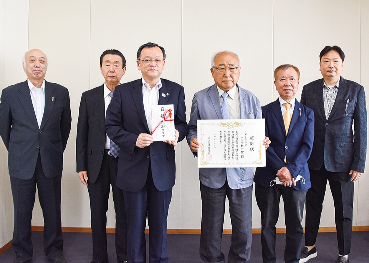 平塚市内の経営者らでつくるグループ「21クラブ」(中村一賀会長)は6月23日、市の福祉事業費にと10万円を寄付した。中村会長らメンバー5人が市役所を訪れ、落合克宏市長に目録を手渡した。