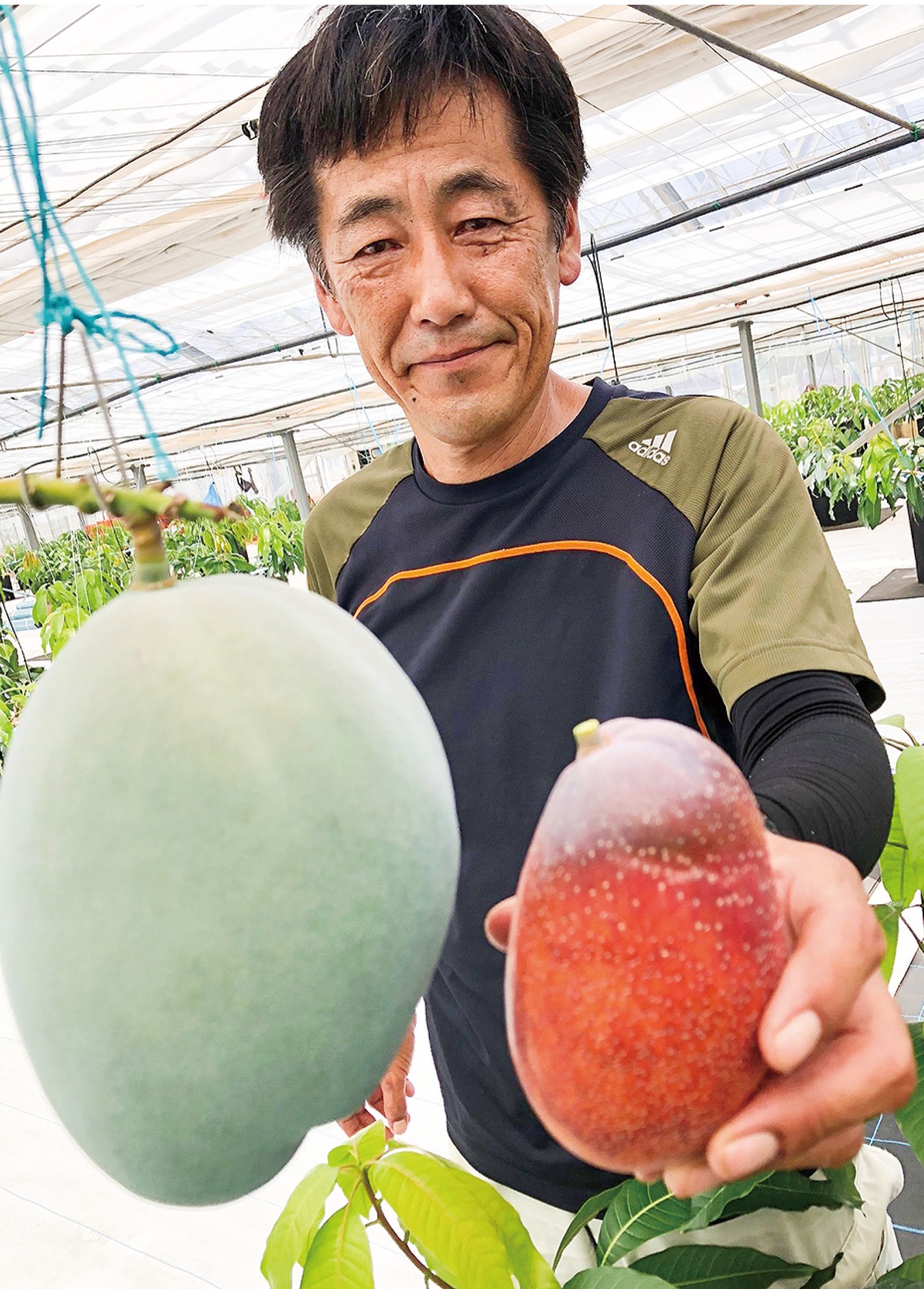 マンゴーの栽培は「平塚の新たな名産品を生み出したい」と考えた臼井さんが昨年5月ごろから始めた。今回収穫したのは、キーツ・アーウィン・玉文の3品種。アーウィンを試食した臼井さんは「糖度は18度以上と甘く、食感も良い」と出来栄えに太鼓判を押す。