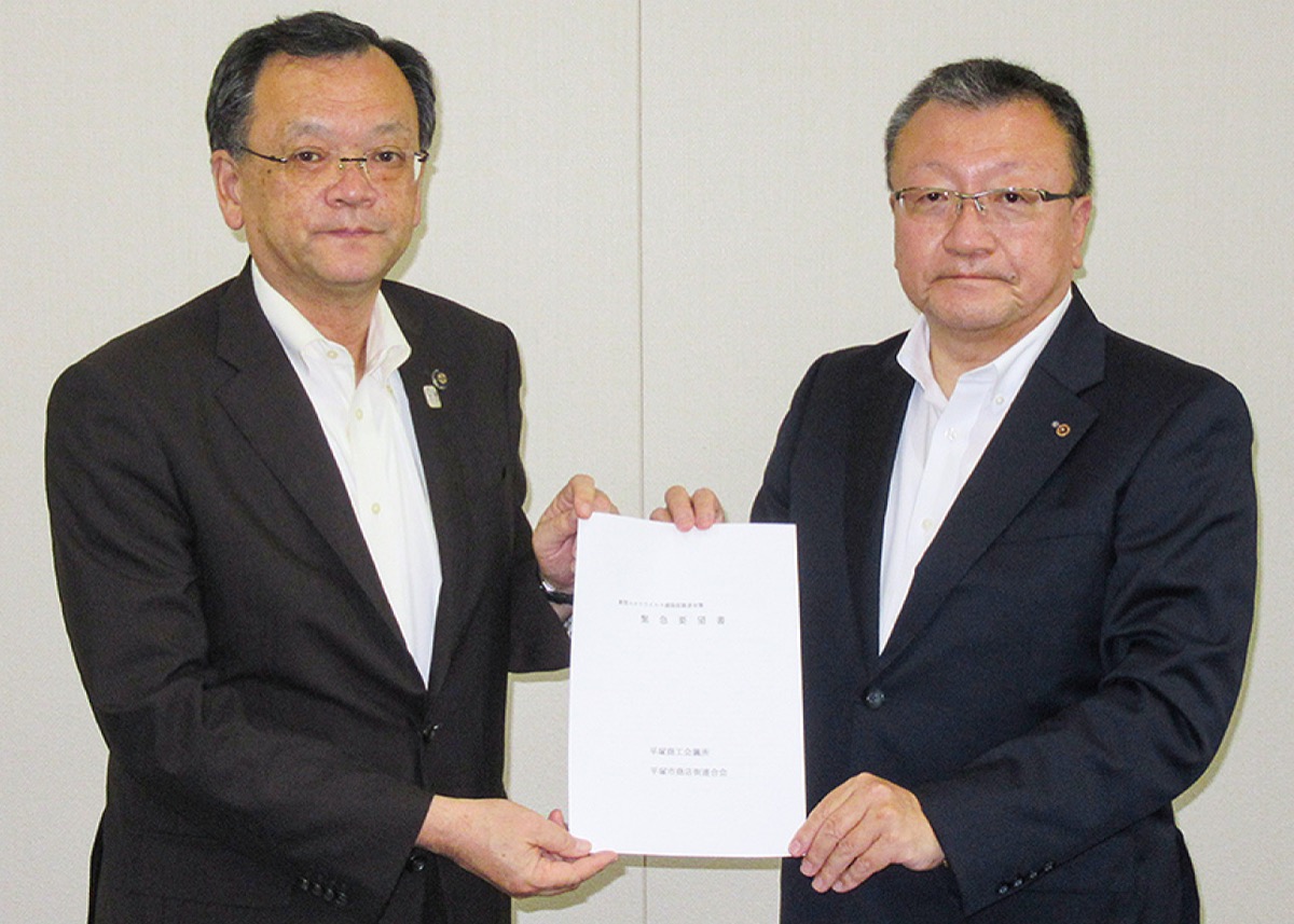 平塚商工会議所(常盤卓嗣会頭)は14日、落合市長にプレミアム付き商品券事業の実施を要望した。4月にも要望しており2度目。市の施策に対し常盤会頭は「経済対策はありがたいが、コロナで困っている経済対策としてスマホを使えない人には不平等だ。キャッシュレスも大事だが皆が参加できる手法を考えてほしい」と話した。