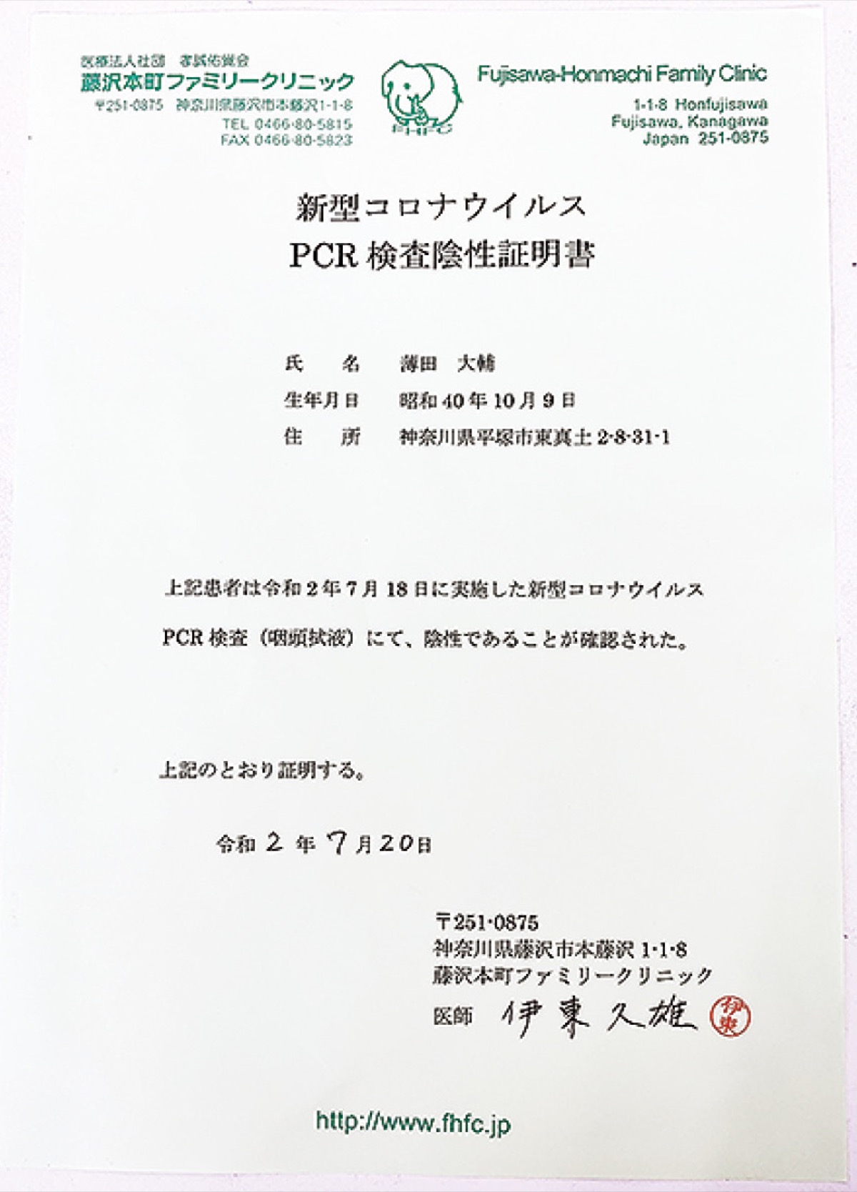 「マスク着用や消毒はもちろん、健康チェックシートを導入するなど感染防止策を講じてきました。私は健康体でありますが、感染者増を受け『打合せなどでお客様と長時間接する機会が多い営業担当の私が感染リスクが最も高いのでは?』と考え、自費でPCR検査することを決めたのです。7月18日に医療機関で検査し陰性と判明。当社専属の大工3人と現場監督も8月7日に検査し全員陰性が証明されました。今後訪問する全てのお客様に「陰性証明書」のコピーをお渡ししてから業務を行います。私は毎月検査を受ける予定です。現場で作業するのは、当社と15年以上の付き合いがあり、素性が分かっている良心会の職人のみ。健康チェックシートも徹底します。コロナ禍の中でもリピーターのお客様を中心にお問い合わせを頂いております。引き続き、繰り返し仕事を依頼していただけるよう心がけていきます」