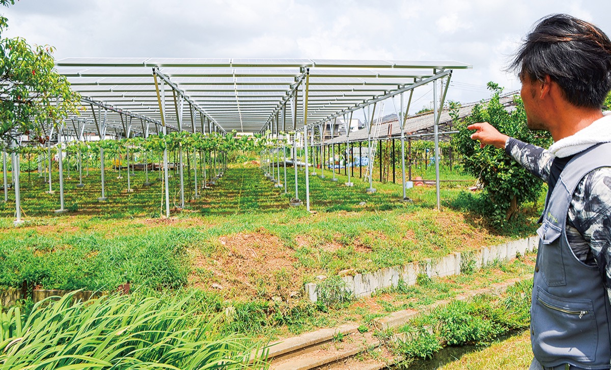 「ソーラーシェアリング」は、農地にソーラーパネルなどを設置し、売電収入を得ることができる新しい発電事業。菊池さんは今年5月から取り組んでおり、400坪ほどの農地に設置したソーラーパネルの下では、シャインマスカットを栽培している。雨が葉に直接当たらないことで、水を媒介とした病気を出にくくしたり、適度な日陰を作ることで、土の湿度を保てるなど営農に関しても利点があるという。