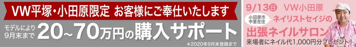 VW平塚/小田原では、9月は認定中古車オータムフェアを開催中。ドラレコやボディーコーティングなど成約プレゼントも満載だ。