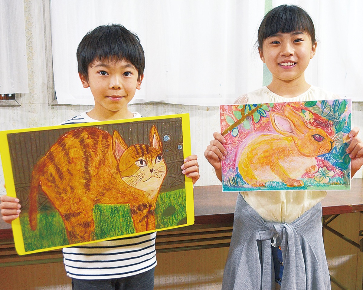 矢野君は竹串を使い豊かな毛並みを表現した『迷子のねこ』で審査員特別賞を受賞。同会で磨いたデッサン力で、伸び伸びと生きる猫を描いた。矢野君は「クレパスを折って使い柔らかい色を出した。猫が大好きなので楽しく描けました」と笑顔を見せた。