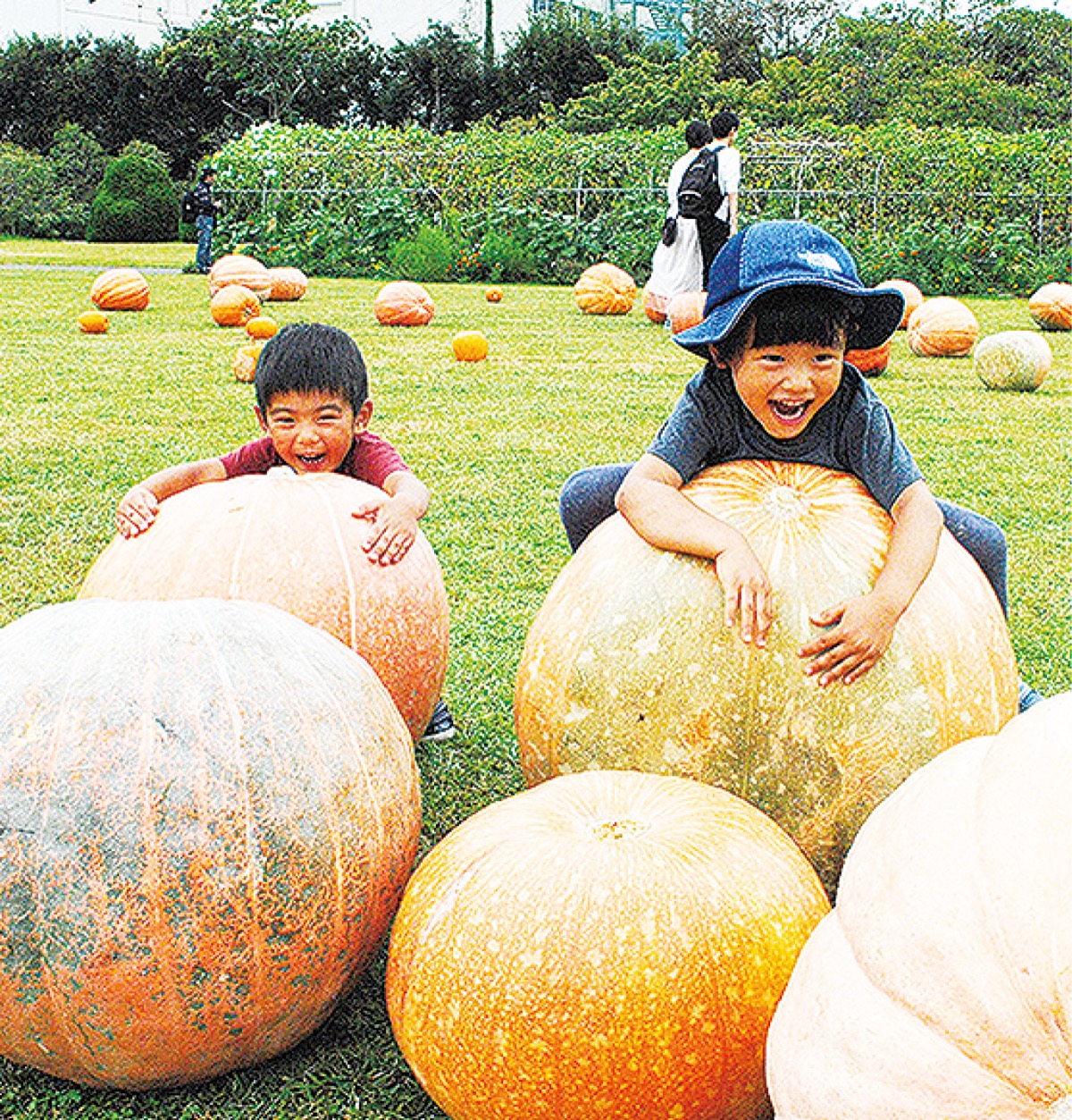 芝生広場にゴロゴロと展示されたカボチャはアトランティックジャイアントという品種で、触れたり、転がしたりすることが可能。写真映えすると毎年好評の企画だ。展示は10月31日(土)まで。