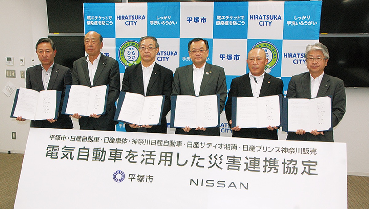 電気自動車を蓄電池として活用。地震や台風、大雨などの災害で停電した際に、市内避難所に日産自動車の電気自動車が最大9台出動し、電力を無償で供給する。日産には昨年9月の台風15号では被災した千葉県に電気自動車「リーフ」が約50台が出動し、電力供給に一役買った実績がある。落合克宏平塚市長は「(日産と)これまで以上に連携を密にし、市民の安心、安全に努めていきたい」と話した。