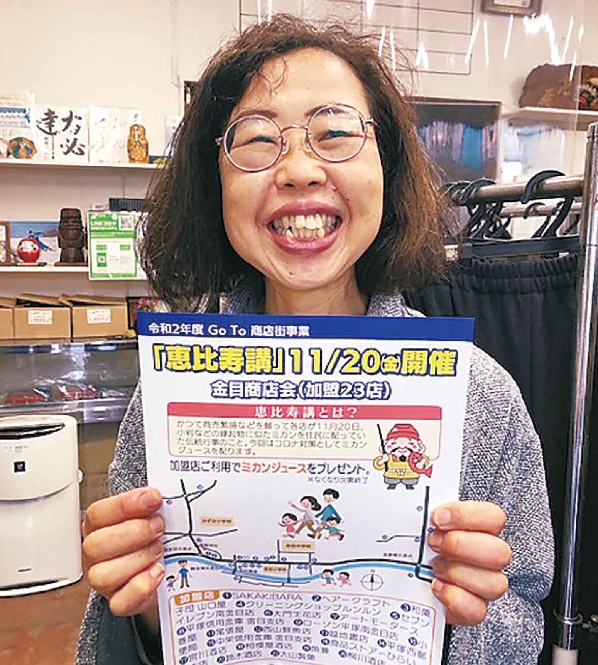 金目商店会が実施する恵比寿講とは、金目地域にかつてあった風習のこと。鈴木会長によると、毎年11月20日、各店が商売繁盛を願い、小判など縁起物に似たミカンを住民に配っていた。50年ほど前までは伝統行事として続いていたが、今では知る人の方が少ない。