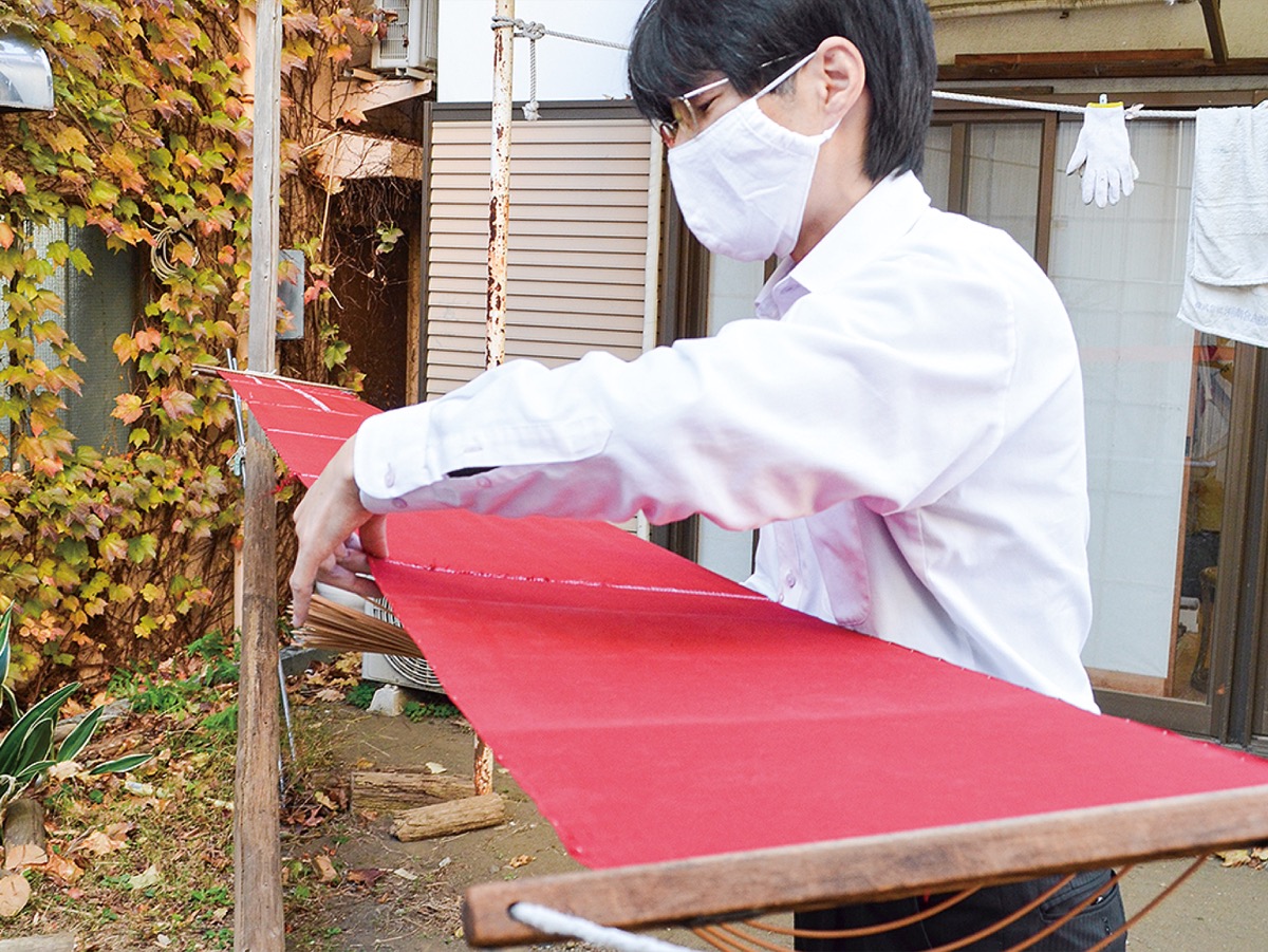 店舗近くに構える作業場が3人の主戦場で、幅約40cm、長さ12mにもなる反物に付着した汗シミや泥汚れと格闘する。反物をなぞるブラシは「力加減次第で着物本来の風合いを損なう恐れがあると」いい、恒一さんらは「不都合がないように見極めることが大事」と口を揃える。