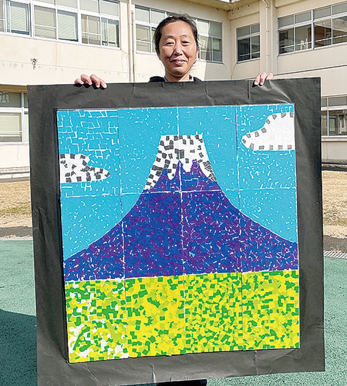 40周年記念作品展では、着色した食塩で描いた「塩絵」や粘土の花瓶、半立体的な「朝顔絵」など、生徒らが授業で手がけた個性あふれるおよそ300点が並ぶ。高等部3年生の共同作品は、A4サイズの紙に12人がそれぞれ貼り絵を施し、12枚をパズルのように合わせて見事な富士山を表現した=写真。