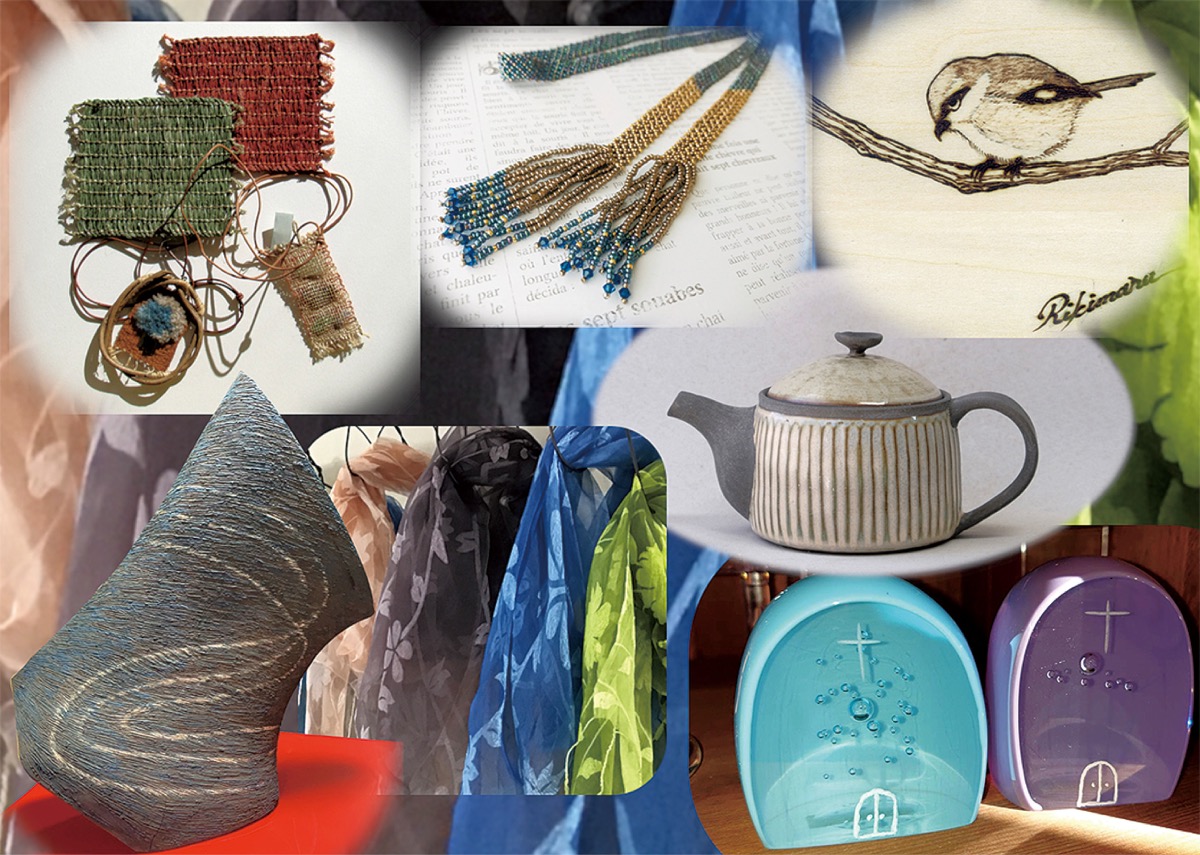 市内からは手織物の田中朋也さん、吹きガラスの小野里澄人さん、陶芸オブジェの金谷研介さんが参加。長野県からはバーニングという手法で木に焼き描く伊藤力丸さん、アイデア光る陶芸家の岡田和也さん、群馬県からは草木染めの三浦由紀さん、綾瀬市からはビーズアクセサリー作家の田島真里さんの作品が並ぶ。