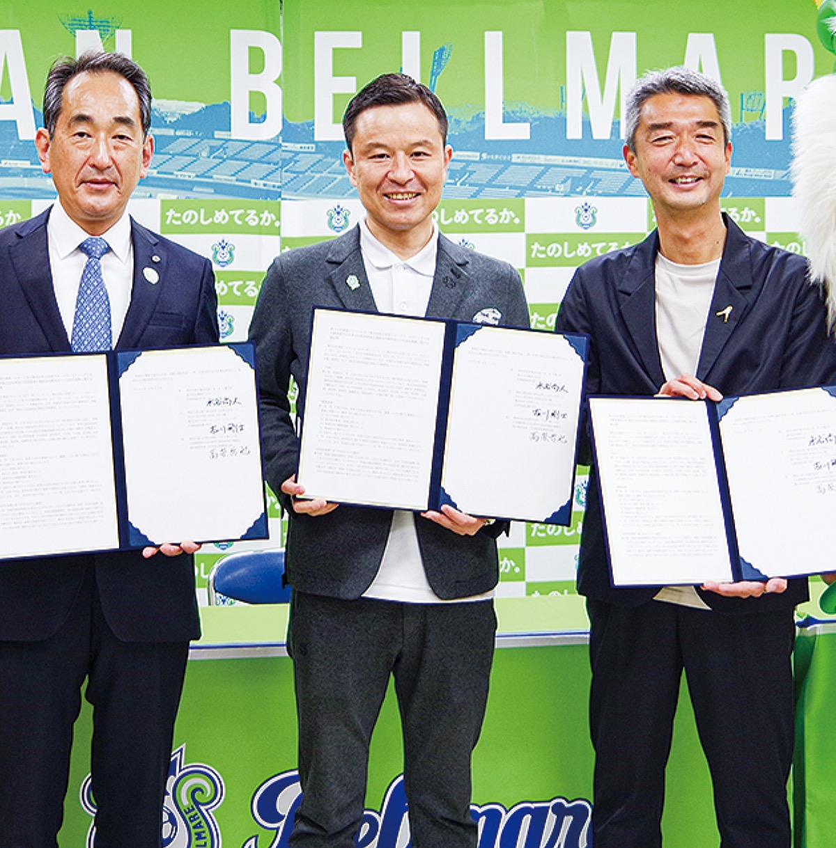 レモンガススタジアム平塚で行われた締結式には、湘南ベルマーレの水谷尚人社長と同連絡会の高梨哲也地区統括局長、フットサルクラブを運営する(株)小田原スポーツマーケティングの古川剛士代表が出席した。