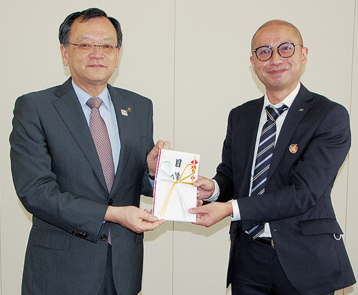 贈呈式に出席したJTの中村桂湘南第二支店支店長は「地域貢献に力を入れている。地域の発展に有効に活用してほしい」と話し、落合克宏市長は「ご支援ありがたい。引き続きまちの発展のために協力してもらいたい」と謝辞を述べた。