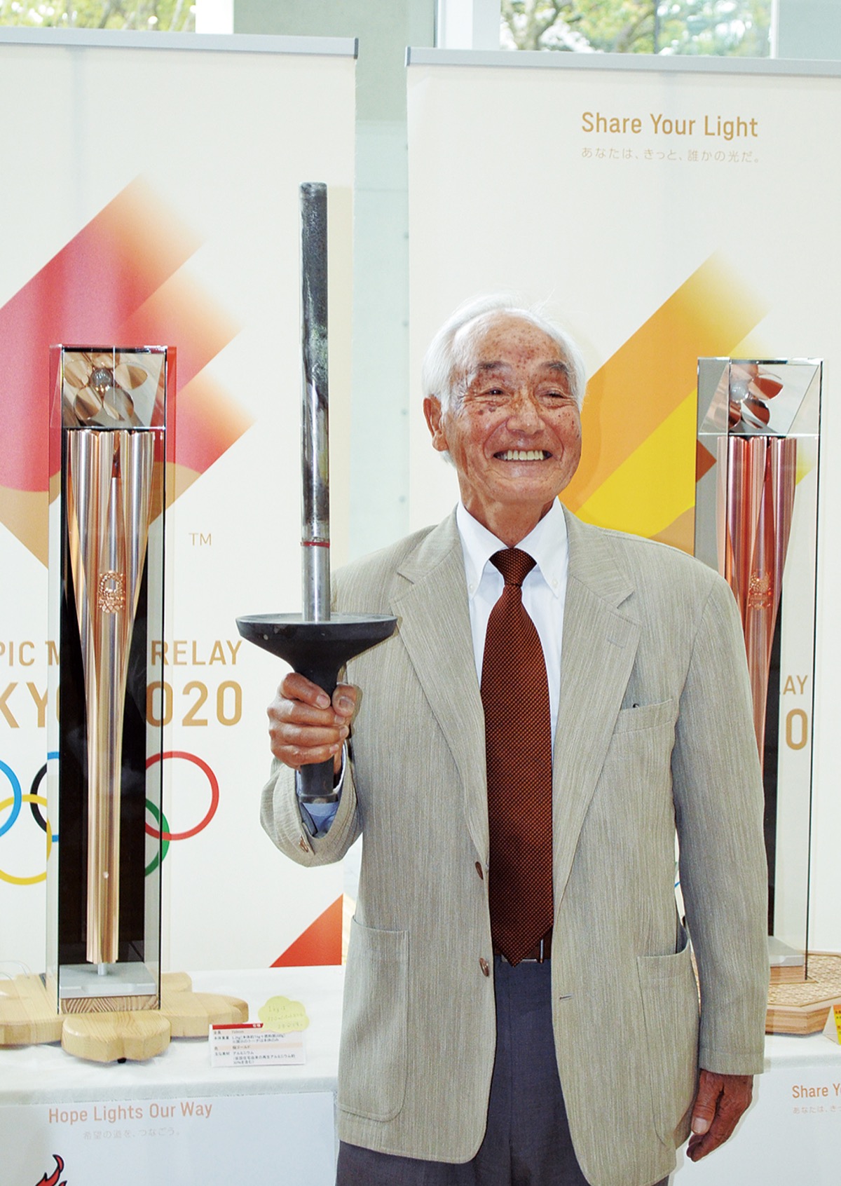 東京2020五輪の聖火リレーが行われる中、1日・2日には市役所1階で聖火リレートーチが展示され、多くの市民が来庁した。期間中は前回の東京五輪で聖火ランナーを務めた下島在住の新藤忠さん(76)が所有するトーチも併せて展示。1日には新藤さんが会場を訪れ、報道陣の取材に応じた。