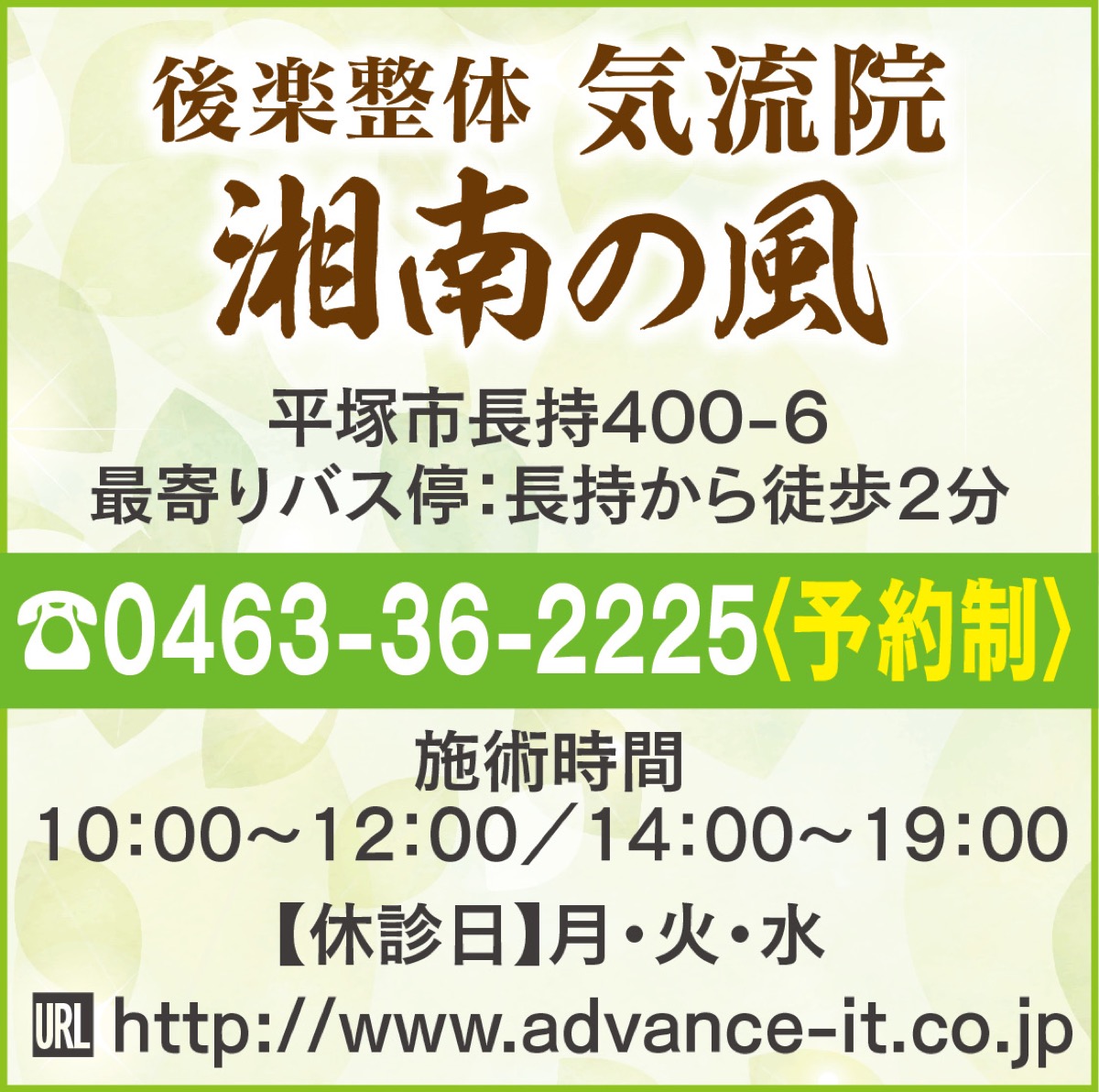 「『整体』とは体を整えること。病気にかからないためには、体を整えることが大切です」と話すのは、長持の整体院「気流院 湘南の風」の伊比輝治院長。同院では整体対応の症状であれば、大半が1、2回の施術で改善できるという。伊比院長は「当院の整体は、様々な症状の改善を見込める『万能整体』です」と自信を見せる。「いろいろな所へ通って回復しなかった症状が解消された」などの声が寄せられているという。