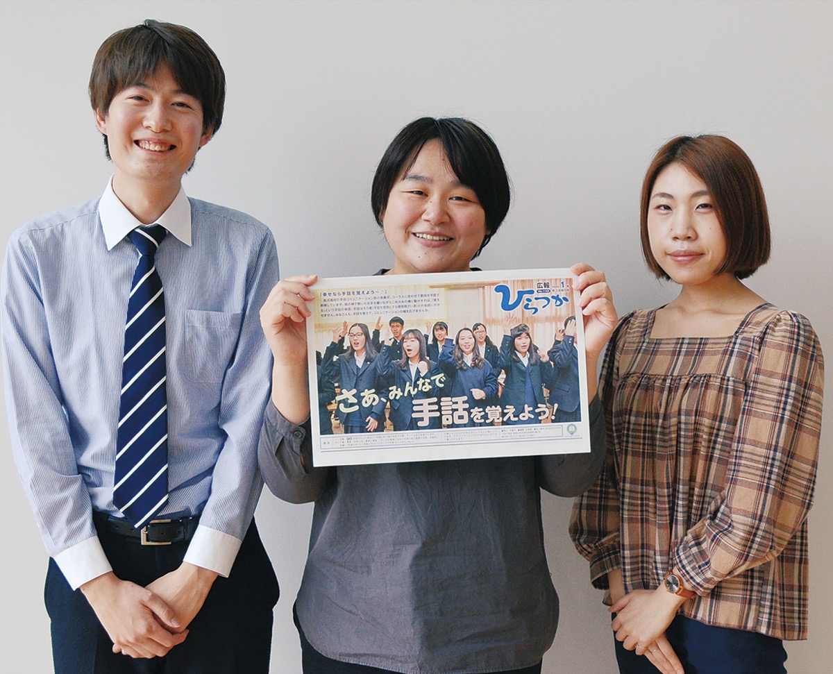 納得いく写真を撮影できたものの、紙面のレイアウトには頭を悩ませた。三澤さんは「部員の皆さんがずらっと並んだ写真は読者の目を引き、広報紙を手に取らせる力があると思った半面、広報紙の写真はいつも縦写真を使っていたので、横写真にしていいものか」と振り返る。それでも横写真の方が、生徒が「楽しみながら手話を学んでいる様子」を伝えることができる、と決断した。