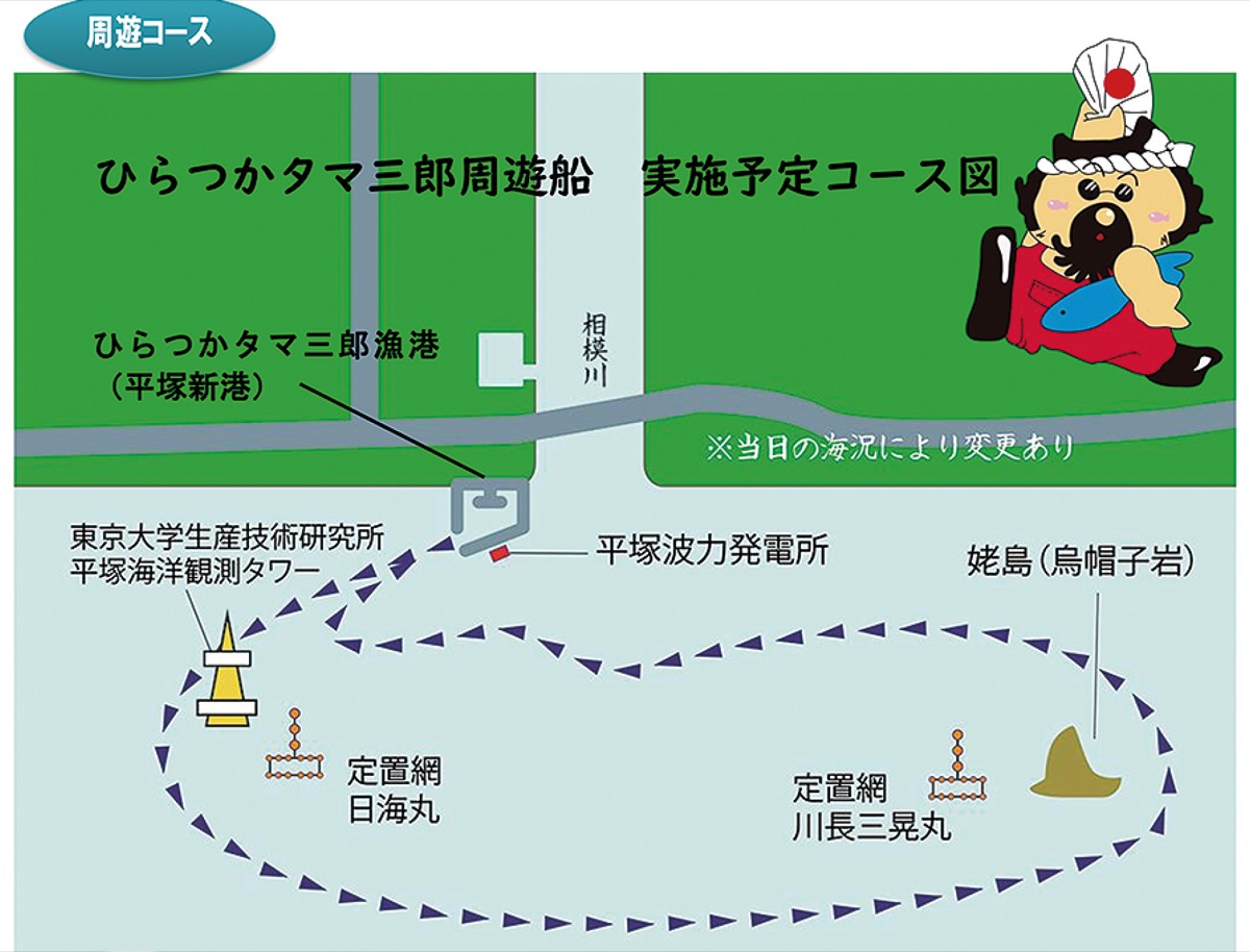 平塚市観光協会は6月26日(土)、相模湾から平塚海洋観測タワーや烏帽子岩を見学する「ひらつかタマ三郎周遊船」を開催する。