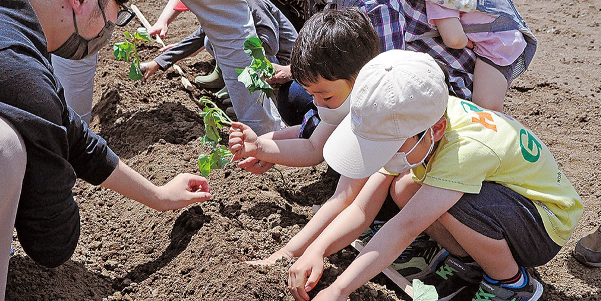 参加者は親子が多く、中には3世代で体験に来た組もみられた。作物の植え付けでは、見慣れない農具の使い方を教わったり、一見簡単そうに見える土を耕す作業に苦戦する姿も。「自分たちの手でつくる」ことを体感した。作業中もマスク着用で密にならないよう、グループに分かれて行動するなど、コロナ対策を徹底しながら進められた。