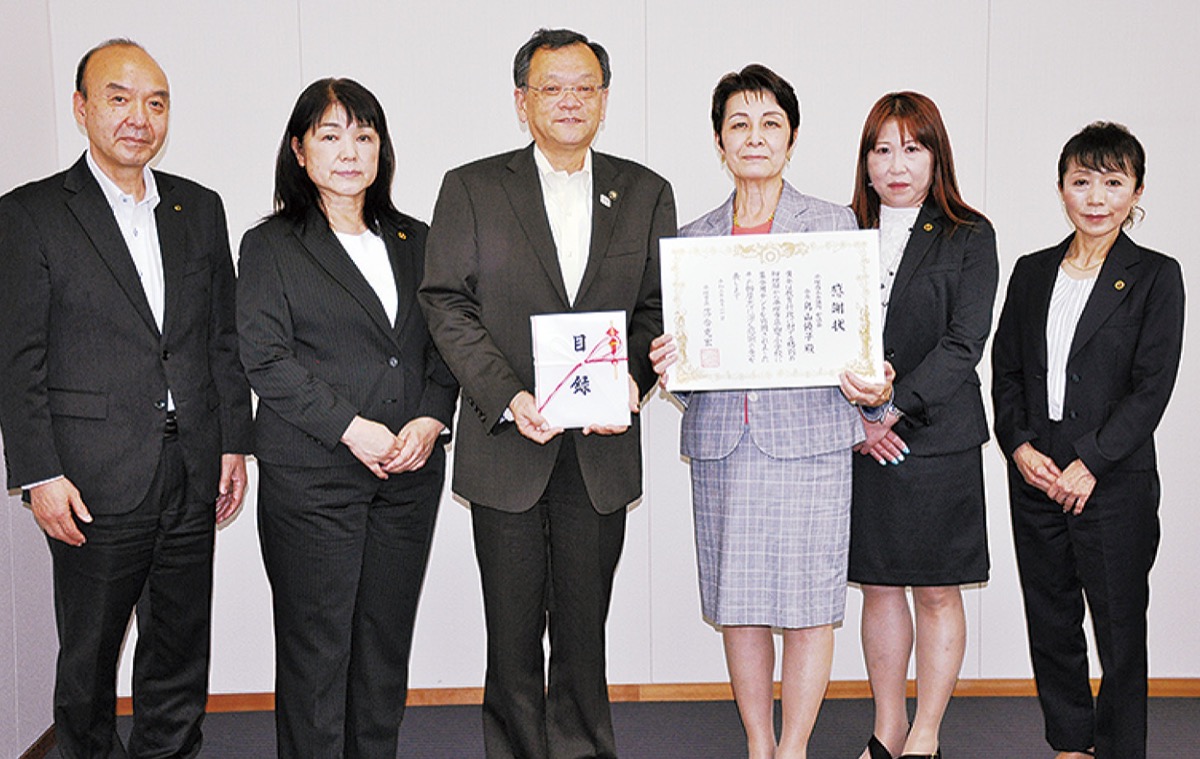 平塚商工会議所女性会(鳥山優子会長)が20日、集会用テント1張を山下小学校に寄贈した。同日、鳥山優子会長ら同会の役員4人が市役所を訪れ、落合克宏市長から感謝状が贈られた。