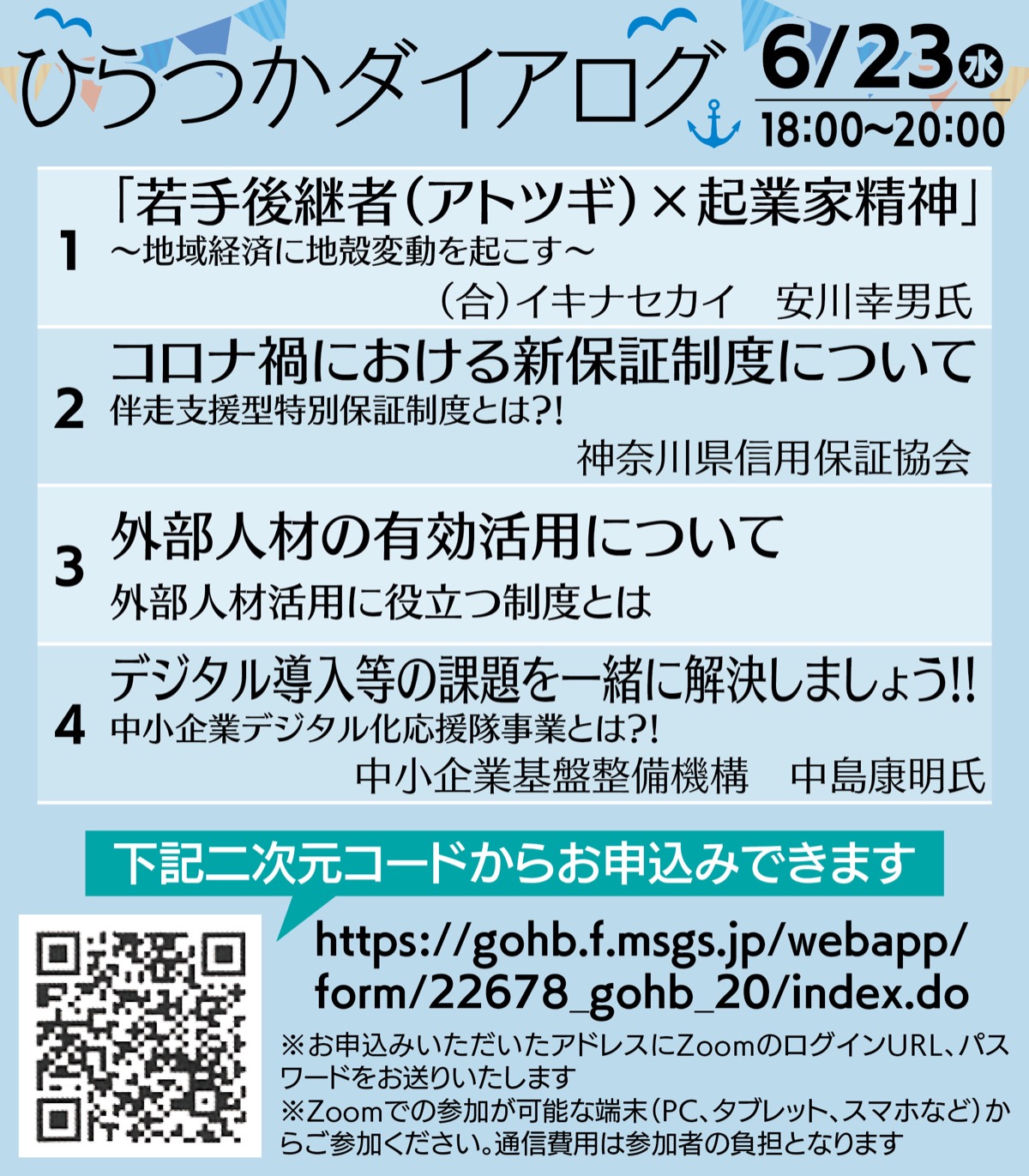 6月23日(水)午後6時〜8時開催のZoomを活用したオンラインセミナー「ひらつかダイアログ」(平塚信用金庫、平塚市など共催)もその1つ。専門家と対話形式で情報を共有し、地域の課題を解決に導く。今回の題材は「事業承継」「コロナ禍の保証制度」「外部人材の有効活用」「デジタル導入」の4つで、興味のあるものを選んで受講できる。参加無料で事前申込制。自治体、団体、事業者など幅広くから参加者を募集している。詳細は左記まで気軽に問い合わせを。