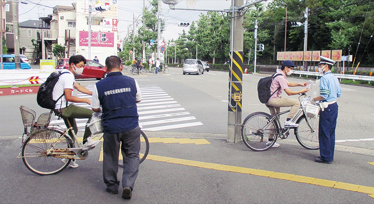 当初は15日に実施される予定だったが、雨天のため延期に。20日に行われ、朝7時30分から1時間、主に自転車で通行する人たちに対し、チラシと駐輪場マップ、ポケットティッシュなどが入った袋250セットを配布し、交通ルールの遵守と交通事故防止を呼びかけた=写真。歩行者に対しては、平塚警察署が作成した道路横断に関するチラシ50枚を手渡した。